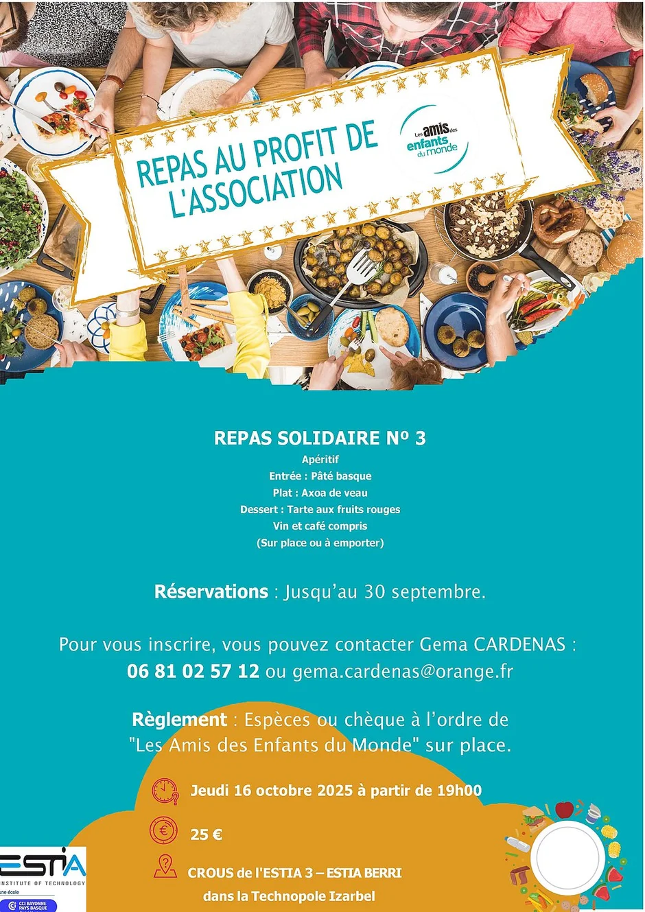 Accueil ESTIA Agenda Repas solidaire Repas solidaire 16 octobre 2025 2025-10-16 - Heure de fin non précisée Lieu:CROUS, ESTIA 3Organisateur:Les amis des enfants du monde Partage Linked In Facebook Twitter Courriel